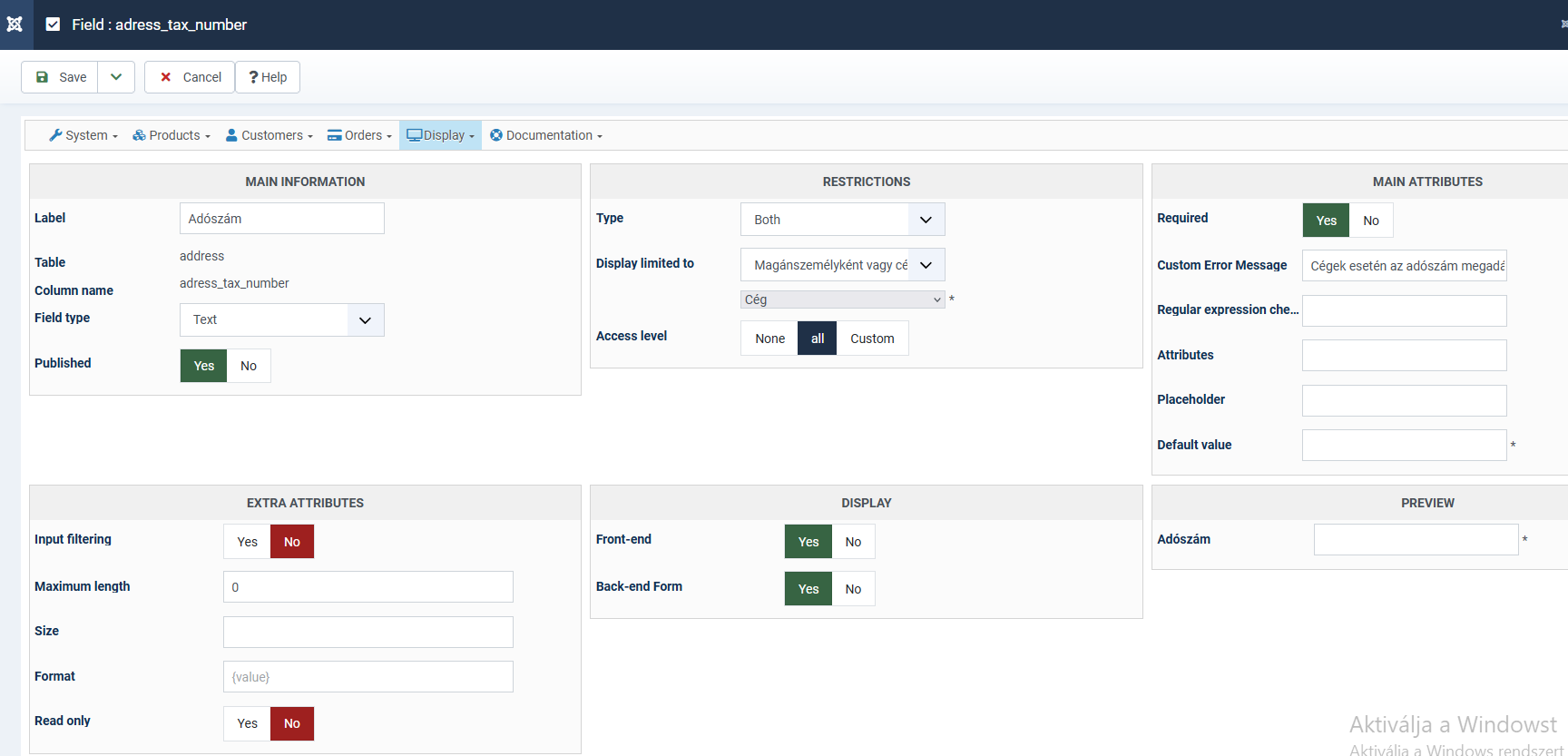 The name of the custom field is address_tax_number, it is enabled on frontend and backend (see second screenshot: address_tax_number.png).