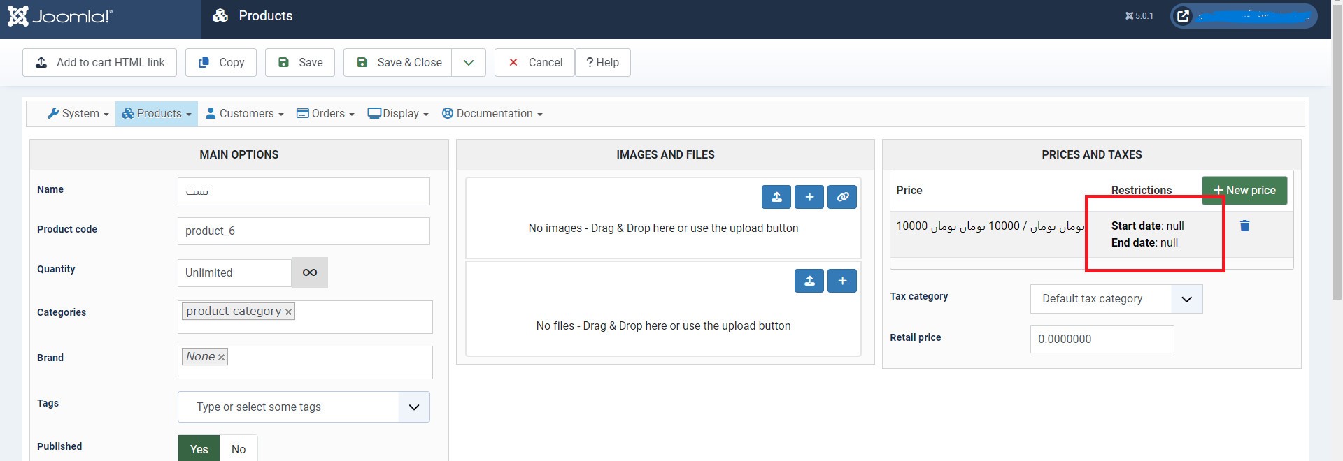We encountered a strange problem. When we enter the price for the product. It displays the start and end dates as null. For this reason, when we publish, it is displayed on the site without a price, and the phrase "Free" is displayed instead of the price.