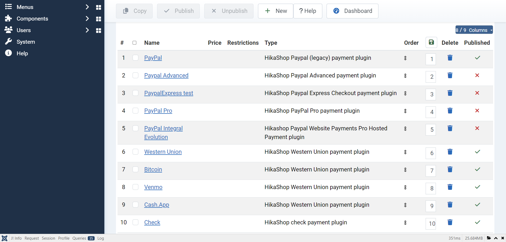 What you're looking at on the HikaShop's side is not the list of payment plugins. It's the list of payment methods. You can have 0, 1 or several payment methods for each payment plugin.