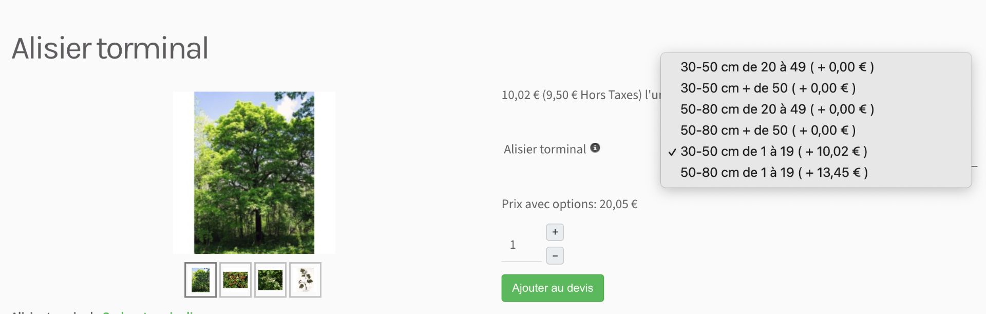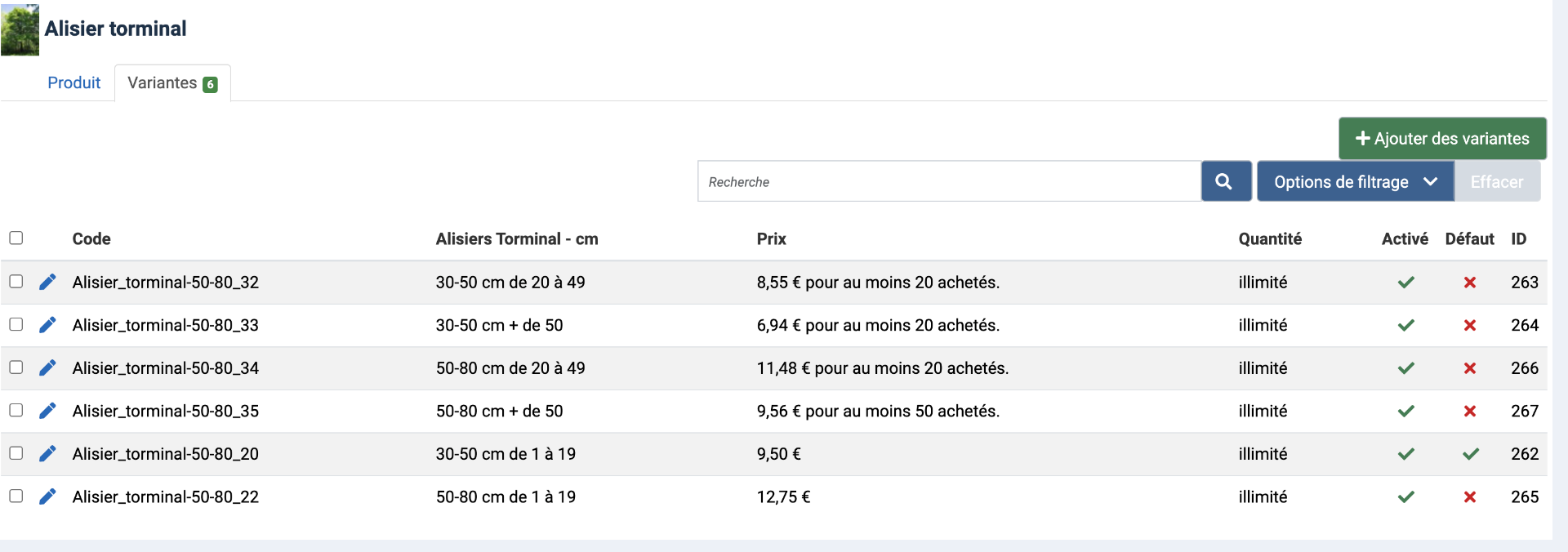 Et voilà, vous aurez un produit avec une variante par taille, et le prix sera calculé en fonction de la quantité dans le panier pour chaque variante.