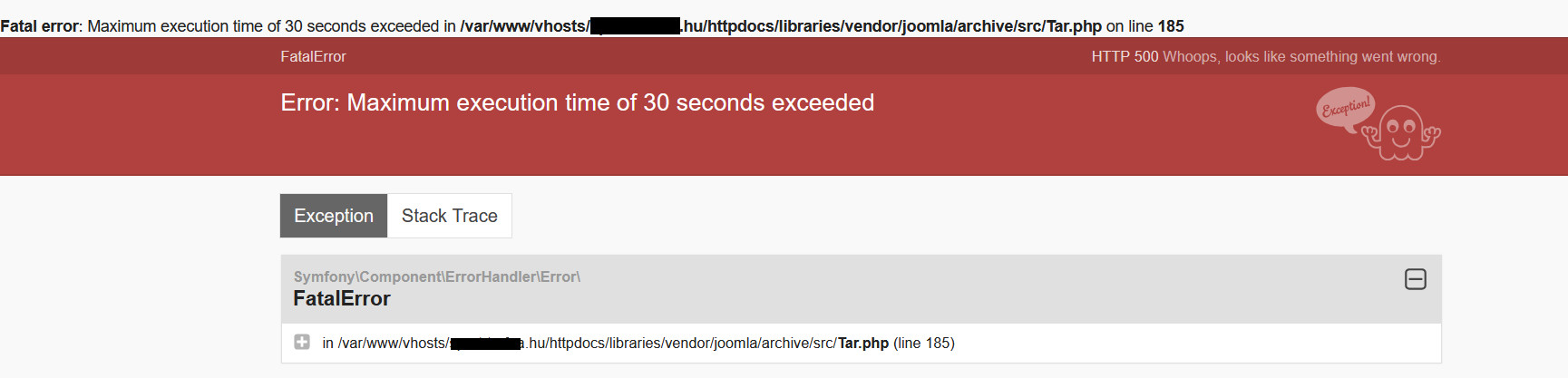 Fatal error: Maximum execution time of 30 seconds exceeded in /var/www/vhosts/xxxxxxxx/httpdocs/libraries/vendor/joomla/archive/src/Tar.php on line 185.