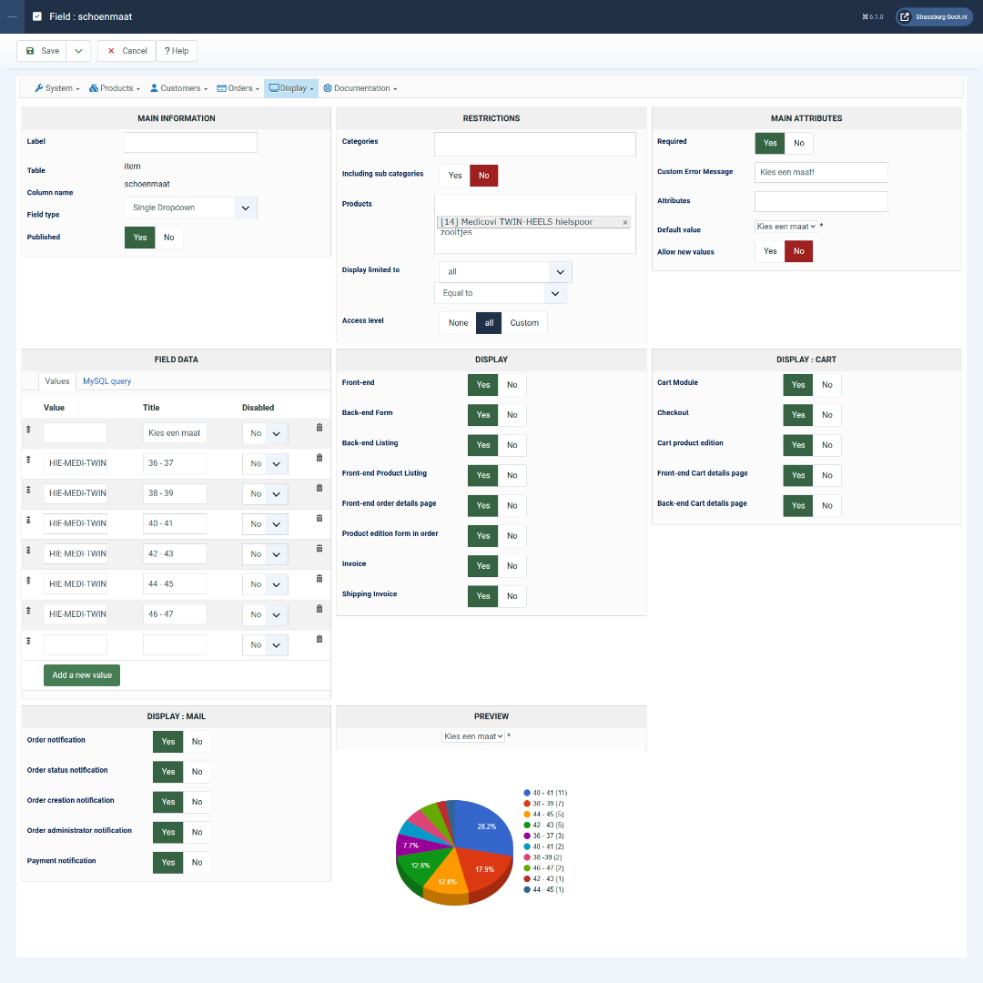 I just updated one of my shops to Hikashop version 6.4.1, coming from 6.3.0. Technically, the update went well, but after testing an order, it turns out that my shop does not work anymore. This may be due to the set-up I have. For historic reasons, my products have their options setup as custom fields. Reason, years ago, when the shop wat set up, it was not possible to have a variant/characteristic set up without having any of the options selected. With custom fields, this was possible, so I created a custom field for every product I have (Table:Item, Single-dropdown). See a screenhot for a random custom field. Note that I am perfectly aware that this is not the advised set-up, but still, this setup should simply work.