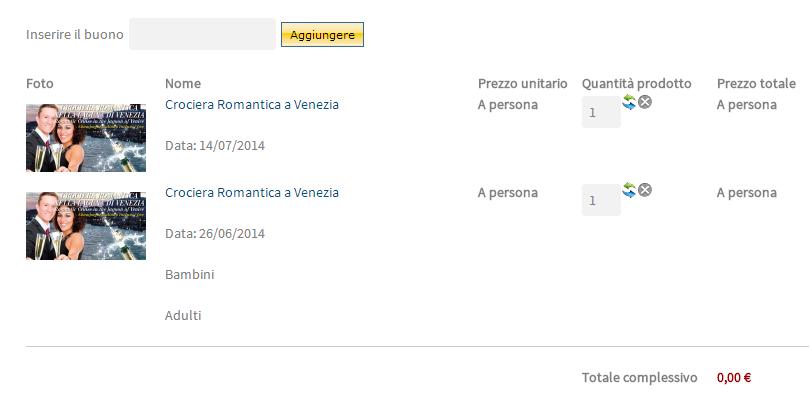When you add the product "Crociera Romantica a Venezia", the product itself is not added in the cart but two other products are added : "Adulti" and "Bambini".