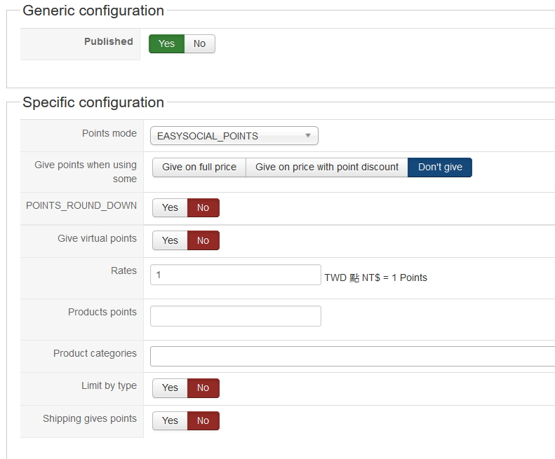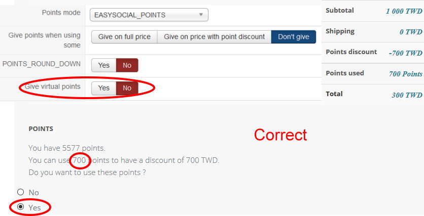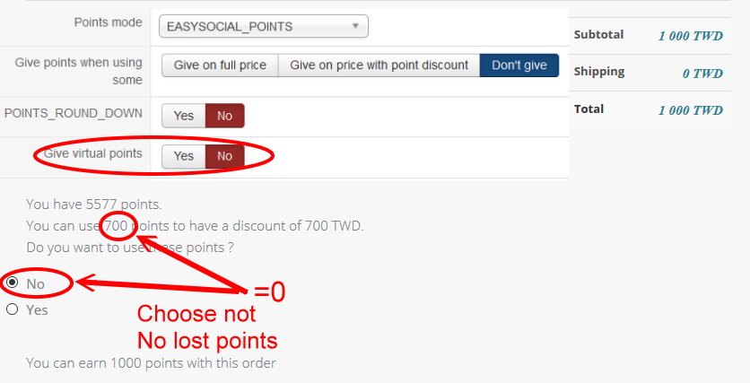 According to the setting "Give virtual points", if I click it no, then it shows that "You can use 700 points to have a discount of 700 TWD". Hence I think you may need to change it to be like "You cannot use any points to get discount". By doing so, it would cause no more misunderstandings from the customers. Thank you.