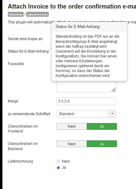 By default, the PDF invoice is attached only to the notification email when the order is getting confirmed (based on the setting in the configuration). You can configure here one or several statuses (separated by a comma) so that it overrides the status of the configuration. For example, if you enter 'confirmed,shipped,refunded' (without the quotes) the invoice will be included in the email notification if the status of the order is confirmed, shipped or refunded.