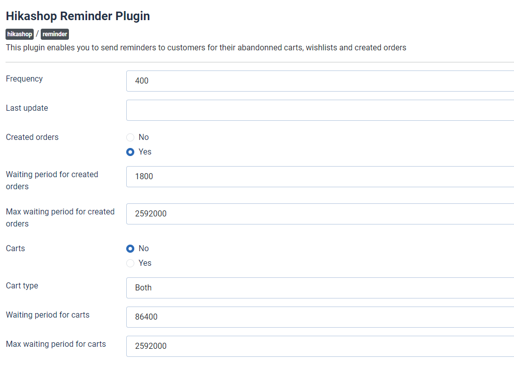 I am wanting to use the reminder plugin to send notification/email to users that leave there orders in created status. I am just trying to get some understanding on how the plugin works. When a email is sent, does it only send one time or send multiple times? And in the screenshot are these values in seconds?