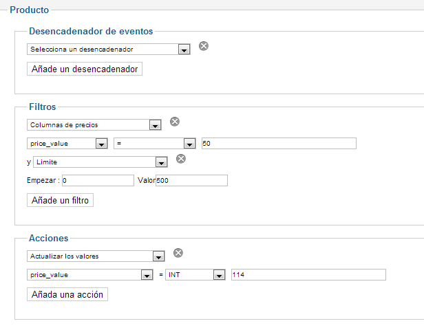 So you probably don't want any filter and only an action with a price of 50 set so that it updates the value of all the products.