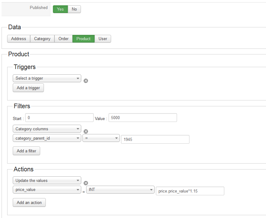 Hi After running this mass action (attached) hikashop has just changed the value of all the products to £0.00 rather than increase the price by 15%. Please can you advise. This on hikashop v2.2.3