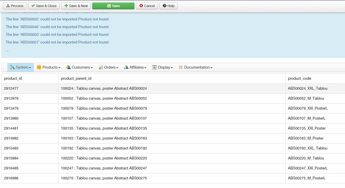 In this export you will see that product_parent_id is the same as in my filter csv - the format ABS00024 for example. Not as it appears in display-products.png