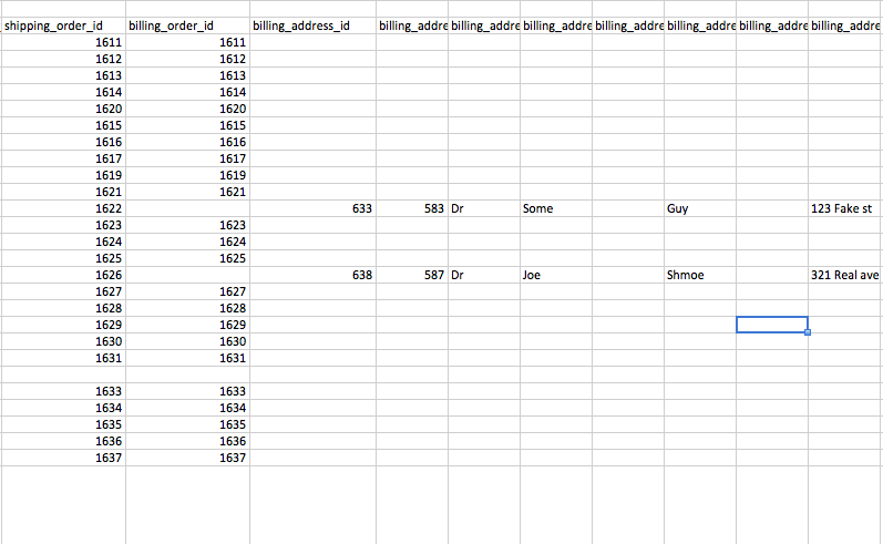 It seems that every row exported with an address contains an entry in the "billing_address_id" field while those without an address do not. Orders exported with an address are also missing an entry in "billing_order_id" (see attached image names changed for privacy).