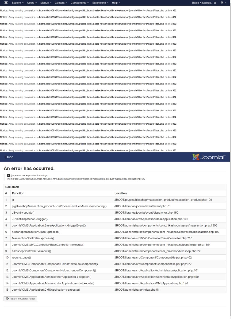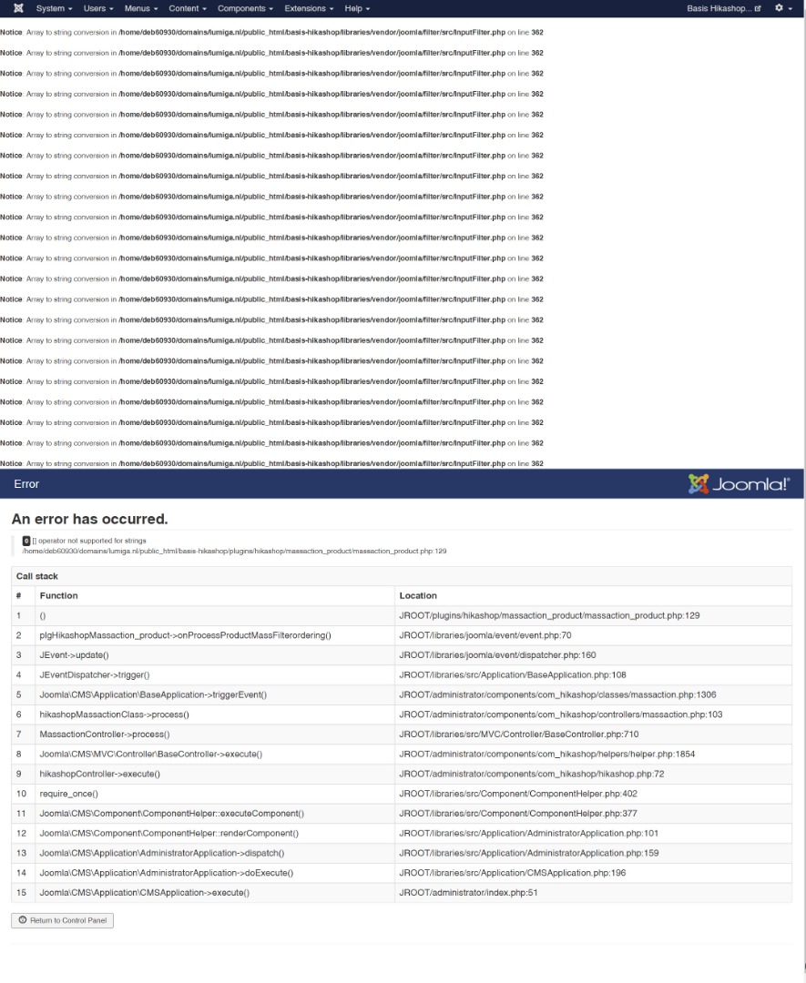 in the file administrator/components/com_hikashop/classes/massaction.php and that will fix the problem for good.