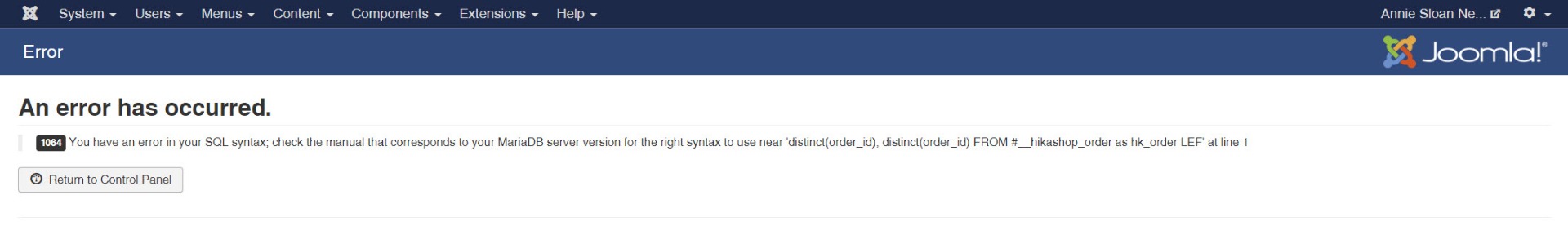 1064 You have an error in your SQL syntax; check the manual that corresponds to your MariaDB server version for the right syntax to use near 'distinct(order_id), distinct(order_id) FROM #__hikashop_order as hk_order LEF' at line 1