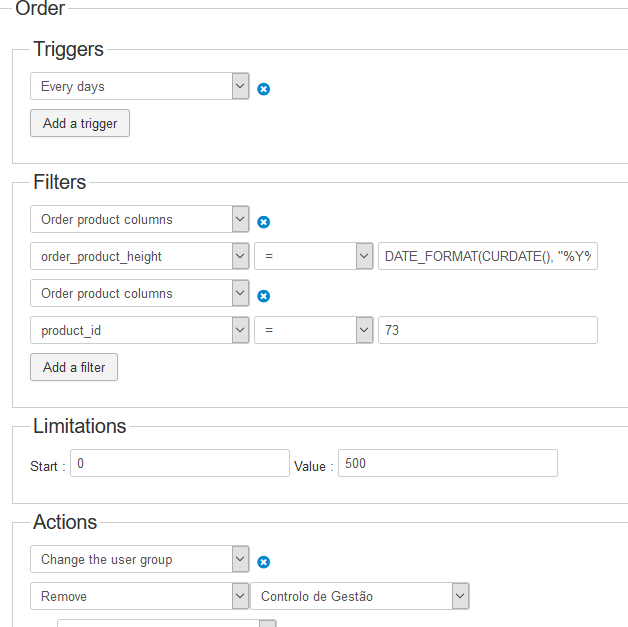 The design of a MassAction can't process an "operation" in your searching value, here, DATE_FORMAT(CURDATE(), "%Y%m%d"), this will only search and compare found value in your DataBase.