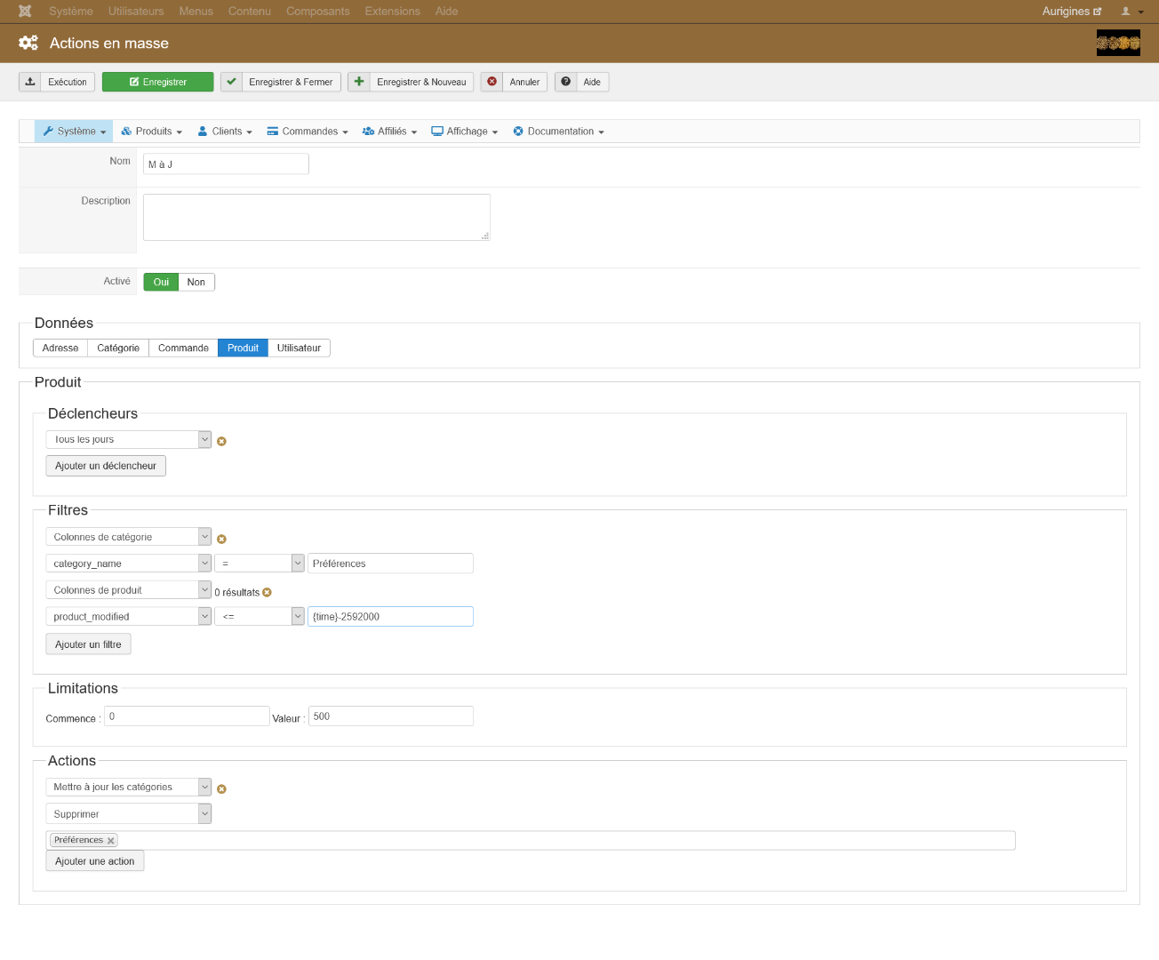 - vous utilisez product_modified et donc le système prendra en compte la date de la dernière modification du produit et non la date d'ajout de la catégorie. Il suffit donc que vous changiez quelque chose au produit dans les 30 jours pour remettre à zéro le compteur des 30 jours. Malheureusement, je n'ai pas mieux à proposer. Ce que vous pourriez bricoler, c'est de créer un champs personnalisé pour stocker la date d'ajout de la catégorie "préférence". Ensuite, vous pourriez faire une mass action pour copier la valeur de product_modified dans ce champs quand ce champs est vide et que le produit est dans la catégorie "préférence". Et dans votre première mass action, vous utiliseriez alors ce champs au lieu de product_modified, et vous auriez une seconde action pour vider la valeur de ce champs (pour la prochaine fois).