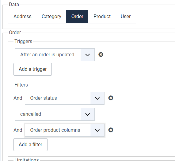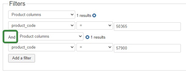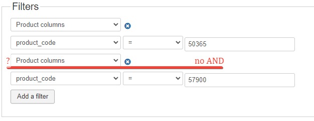 If i do it the other way around, i can add the order_status cancelled, and then add the order product filter, but cannot choose or specify the filter conditions . .