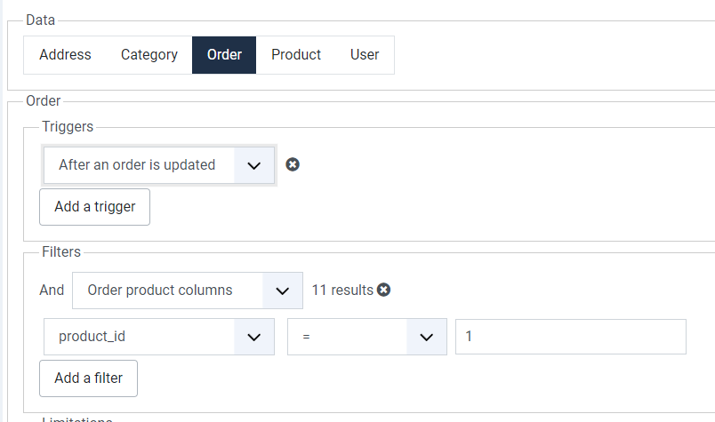 I have triggers setup and working when a product of a certain type (Filter Set to order product column -> order_product_id = 1) is set.