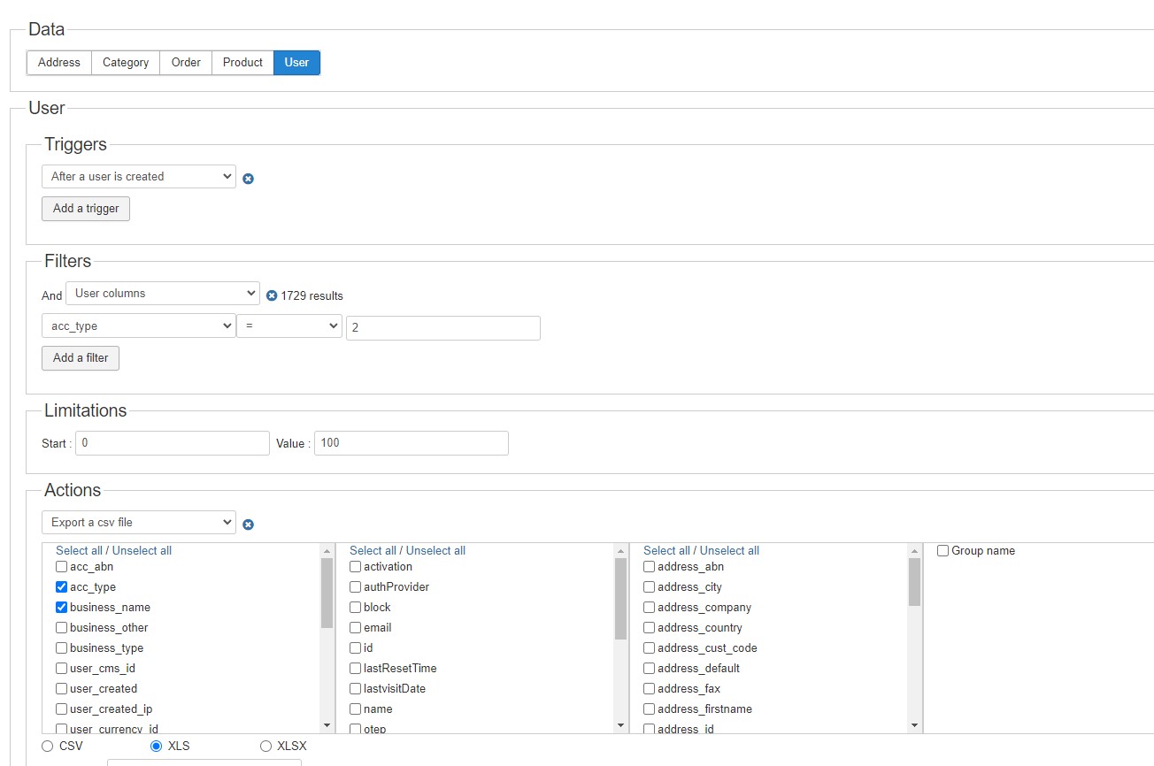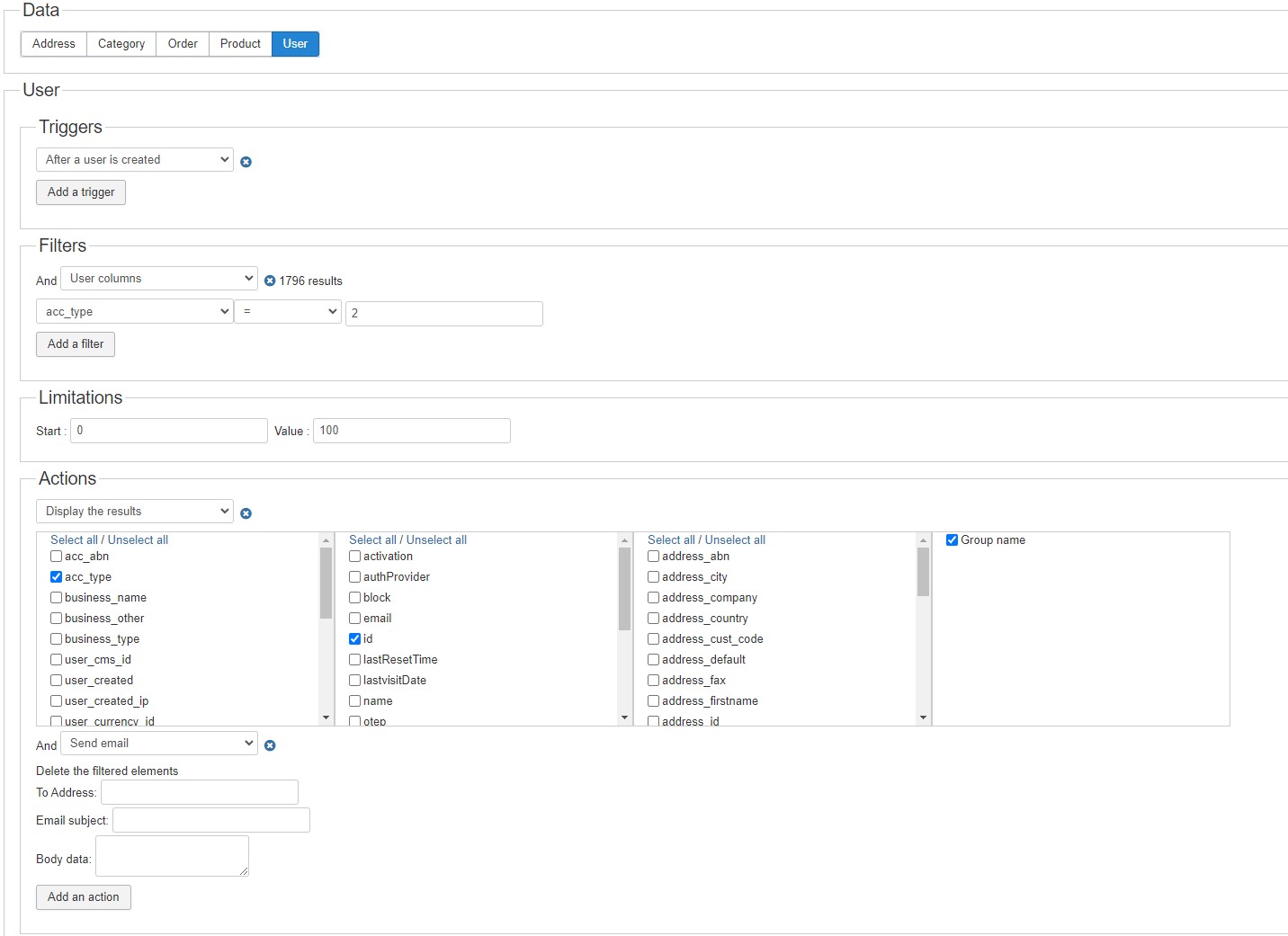 So that's why your mass action would be empty. The "after a user is created" event would actually be before the user data would be saved by the registration process.