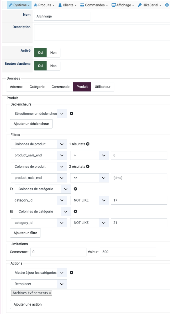 - Once I have all the filters I need and the results I want, I can add the real action I want (I even usually add a temporary extra filter on the product_id being equal to one product on the list so that I only process one product when testing the action. That way, if I make a mistake in the action, or there is a bug, it only affects one product which I can easily revert).