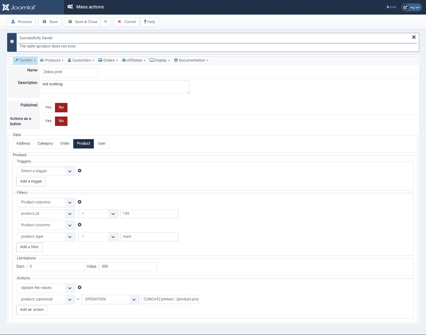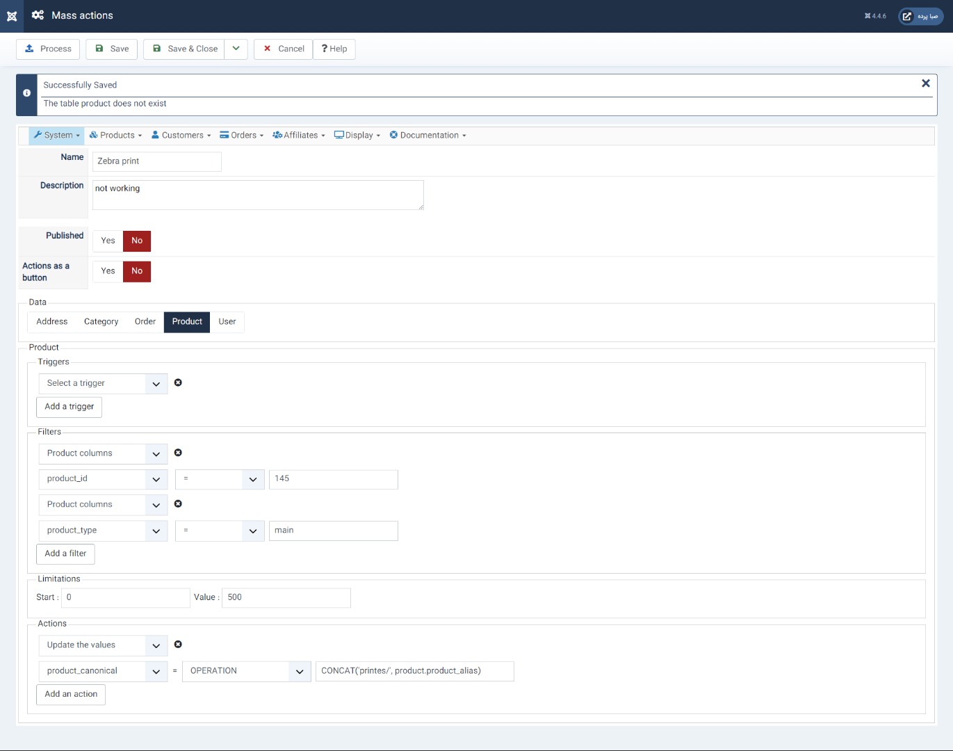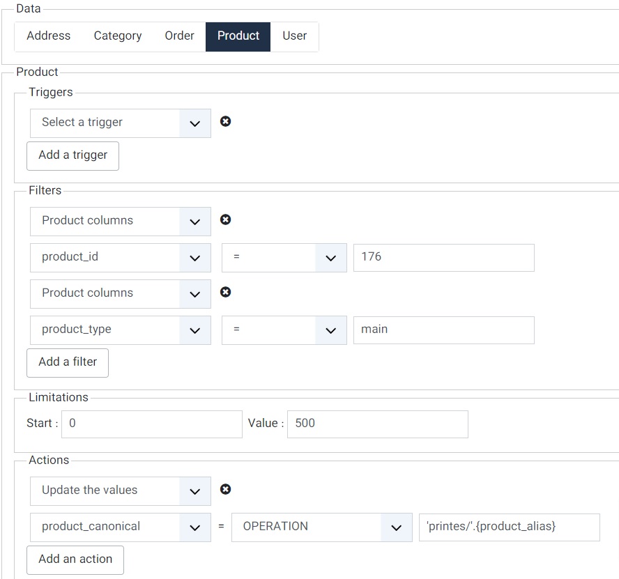 OPERATION In that case, you can provide a formula with arithmetic operations (if you're processing numbers), or text operations (if you're processing text). You can also use tags like product.product_name or price.price_value or order.order_full_price or user.user_email, etc in your operations. These tags must match with the column names in the database for the corresponding tables. For arithmetic operations, you can use the MySQL numeric functions, and for text operations, you can use MySQL string operations. This can allow you to update product prices, generate the canonical URL from the alias of the product, update stocks, automatically fill custom fields, etc.