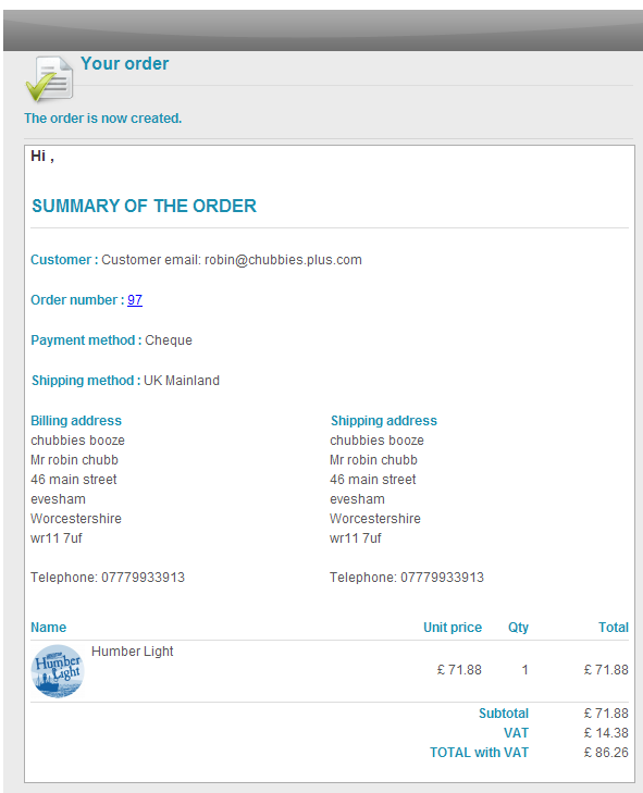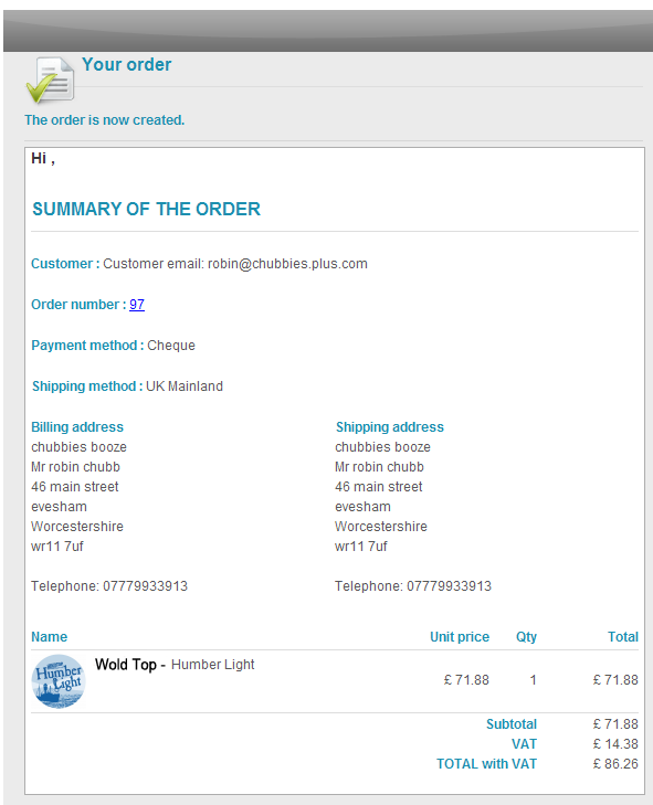 What I've been asked to do is add the brewery name to the order summary email, in this case it's the text "Wold Top -".