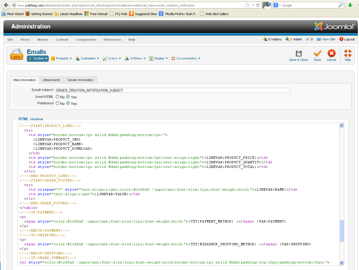 Now I've already created a custom field in the products table, and I'm inserting it into product > listing > img_title.php to display the brewery on the product listing page. So my question is can I use this same code (which is <?php echo $this->row->brewer; ?>) to display that custom field on the order summary email or do I have to do something different?