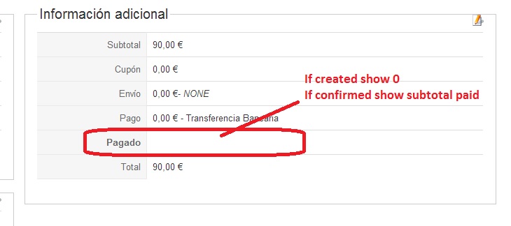 I need add a custom field in order view (aditional information), I need manage payments, when the order is created i need to show 0, and when the order is confirmed show the subtotal price.
