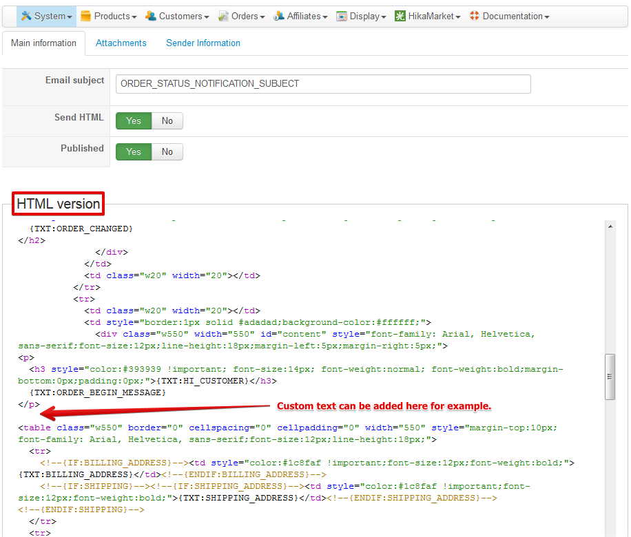 I'm looking at the HTML version of the ORDER_STATUS_NOTIFICATION_SUBJECT under System/Emails. There is Main Information, Attachments, and Sender Information. Just below it is the Text version which I'm ignoring at this time. Where can I find the documentation that explains how to edit the email? Do we edit the Main Information or Sender Information? What does "{TXT: ORDER_TITLE}", etc mean? Is this where I make the change? My client has zero coding experience so I have to give them exact instructions on how to make changes.