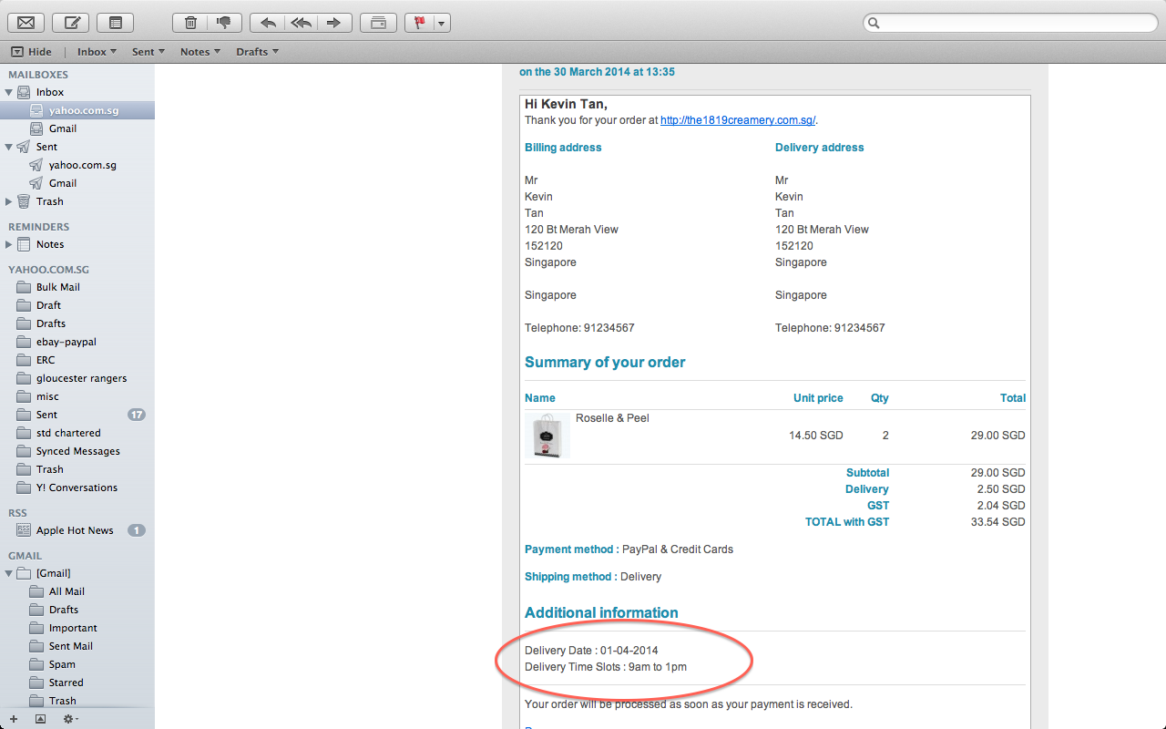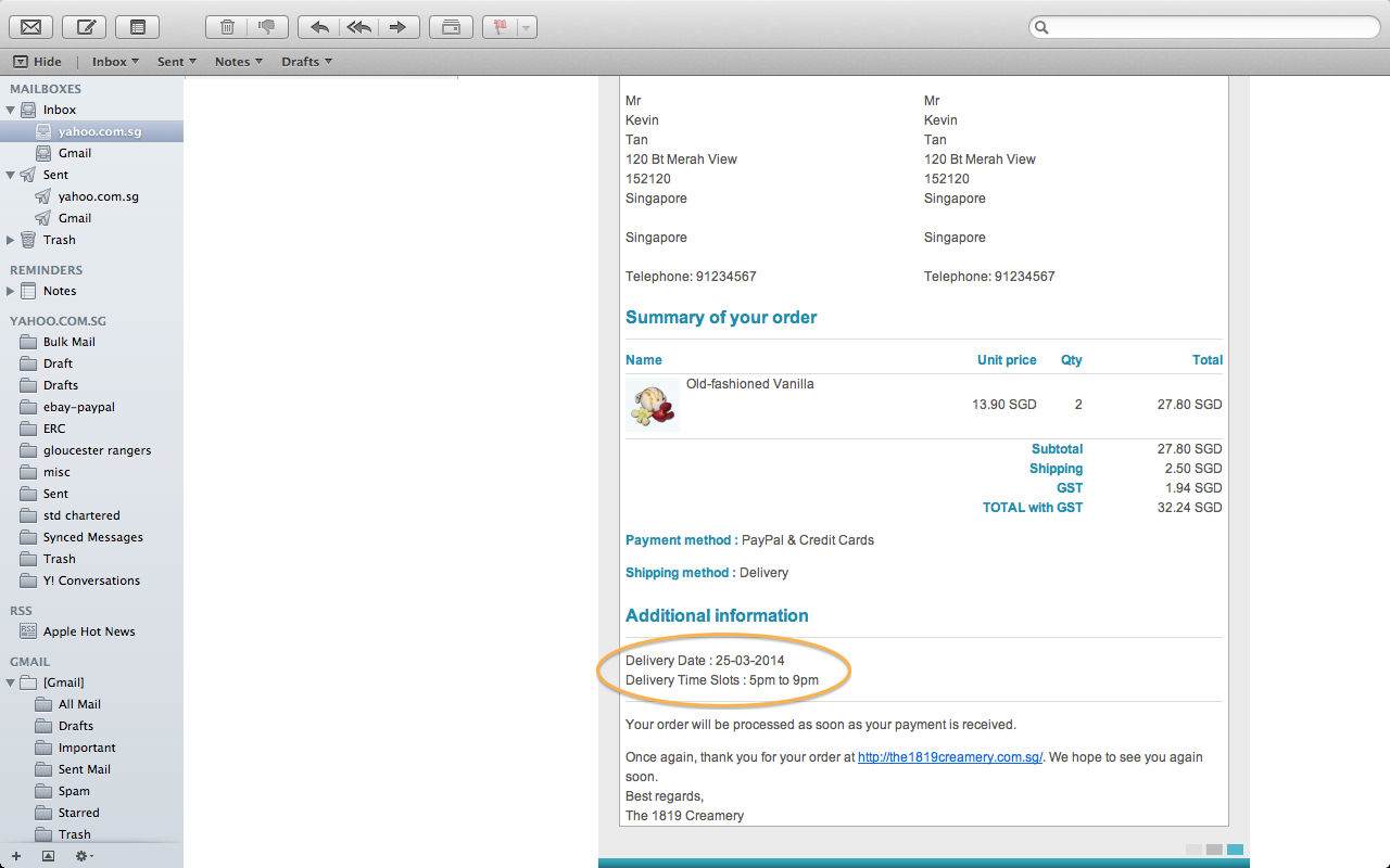2. So, if I don't click on the date field (as most people won't click on it if it shows the delivery date they want), & complete my checkout, the order creation email will show the delivery date as "25-03-2014" (Screen Shot 2).
