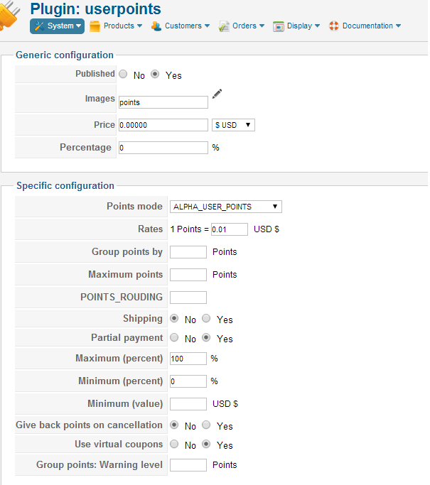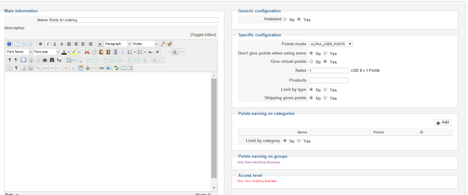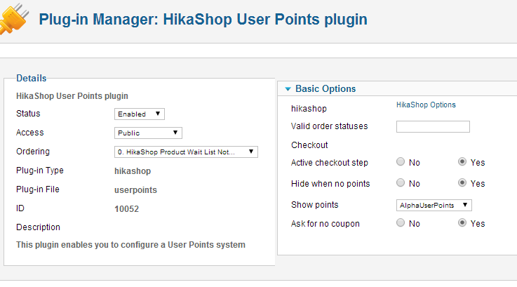 The first screenshot is still in the Joomla part so it won't be useful for configure the gain of points. But it is the right plugin, just not the right place.
