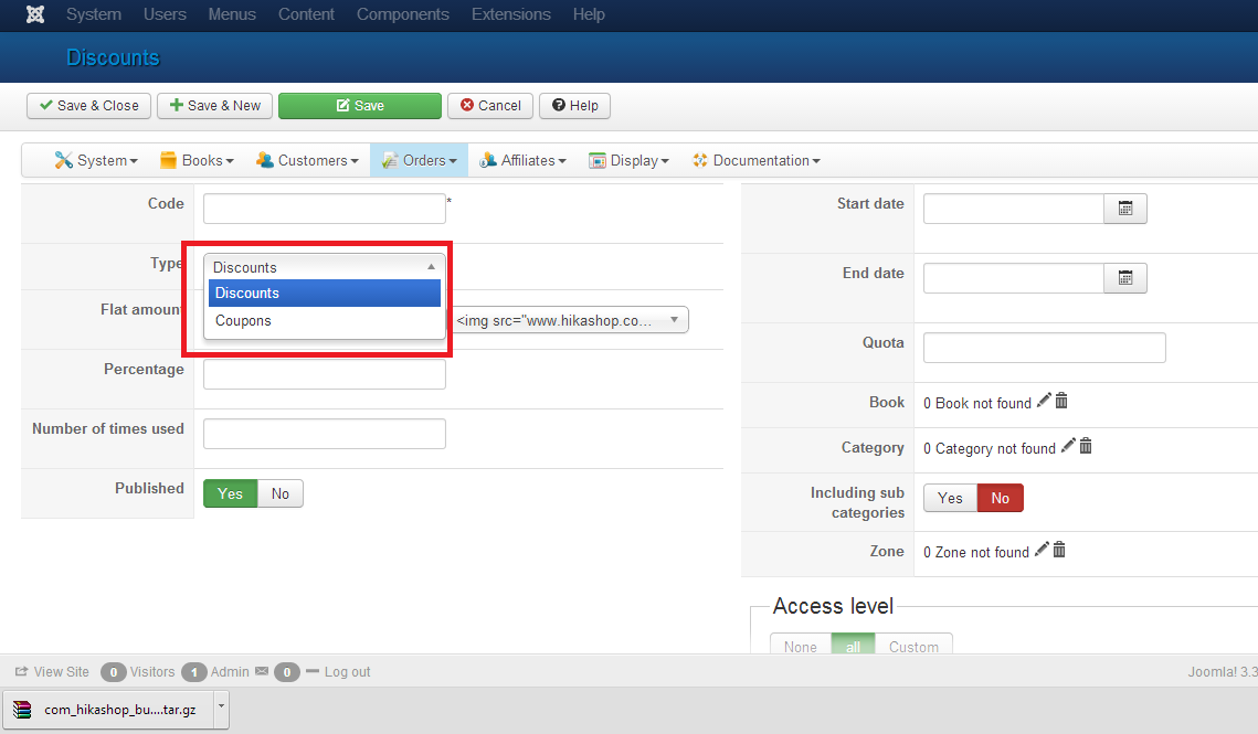 The file to edit is "administrator/components/com_hikashop/types/discount.php", in that file you can add the entry as a new 'select.option', then you will have to edit/add javascript to change the displayed fields.