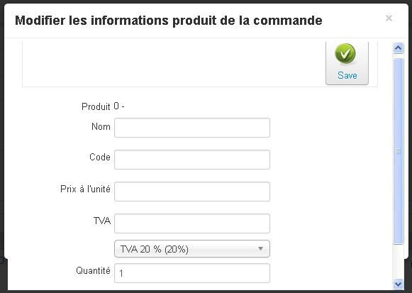 0 - est indiqué à droite du champ Produit, es autres champs (Nom, Code, Prix à l'unité, TVA, Quantité) sont vides.