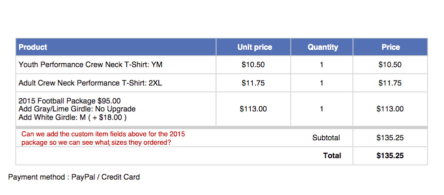 I have custom fields for different sizes on a product that is set to "Group options with product". The email that goes out shows the custom fields fine, but the orders on the back end do not show the fields chosen unless I click the edit order button. Is there a way to show them so that it's easier when processing the orders?