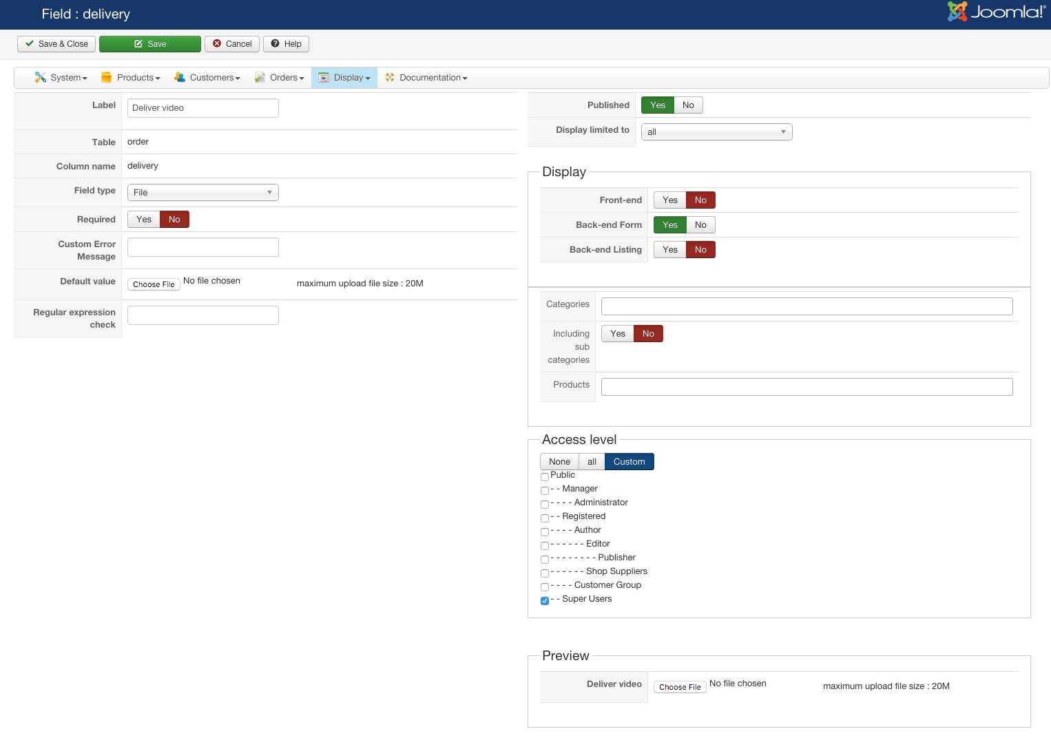 Note that as per your server restrictions, you can't upload files bigger than 20M. Maybe it comes from that that it doesn't work ? Did you try with a small file ? Also, you're limited to the extensions that you allowed in the Files section of the HikaShop configuration so please check that.