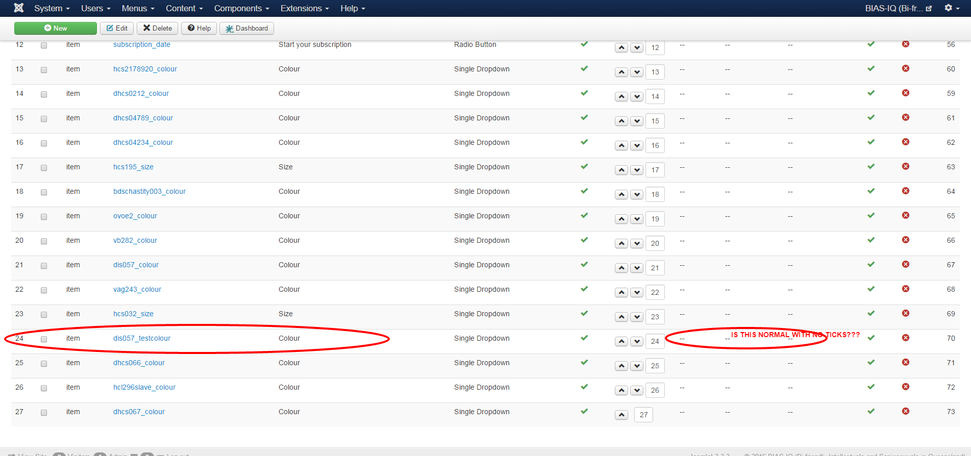 There are 23 items that have a custom field applied to them from the back end of Hikashop. These custom fields are of the "ITEM" table type and allow the user to select a value for "colour" or "size" usually. They are all the "single dropdown" type and have multiple values to select from. The default value always starts as "Select" "Please select an option". I have entered a "Regular expression check" of "^((?!select).)*$" on each custom field so that it does not let them leave it on the "select an option" option, it forces them to change it before adding to cart.