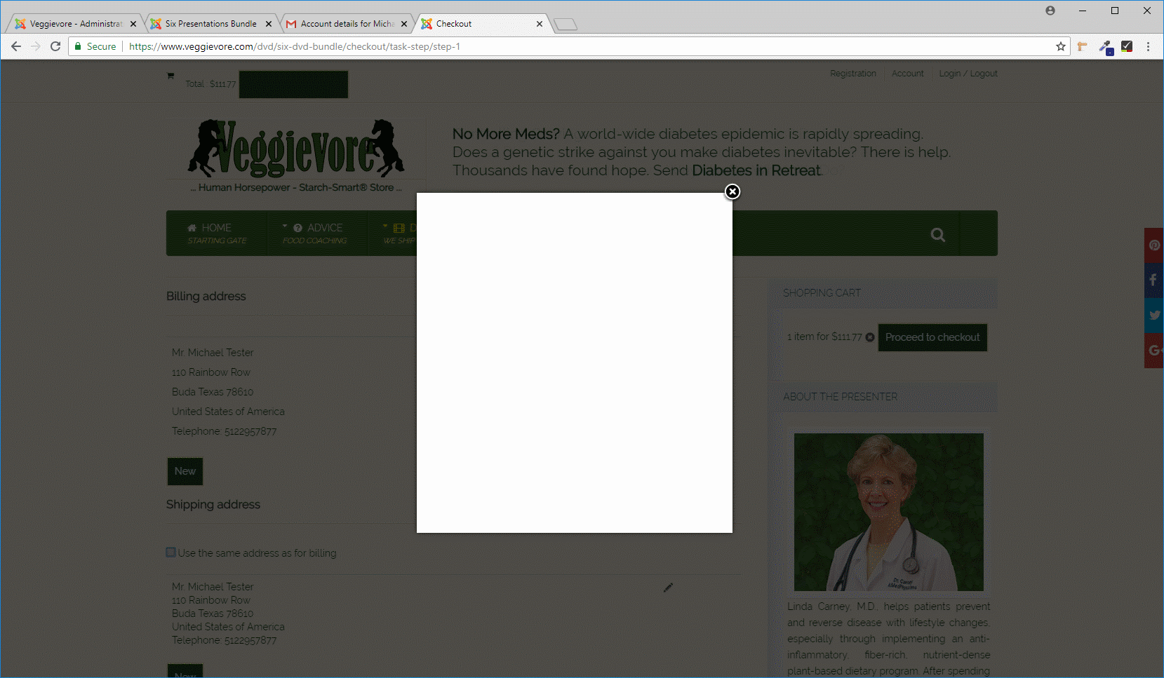 Also, I see that you're using the old checkout system of HikaShop 2.x. I would recommend turning off the "checkout legacy" setting of the HikaShop configuration in order to use the new checkout system of HikaShop 3.x. The checkout will work better and you won't have that popup issue either as the address edition don't use popups with the new checkout.