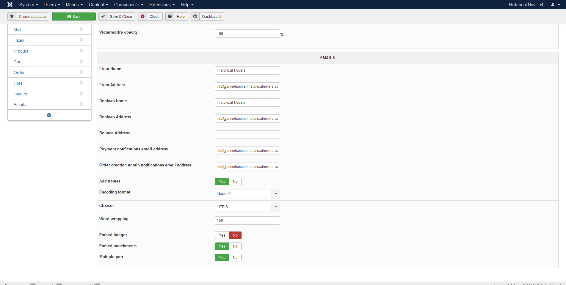 - a screenshot of the settings of the Email section of the HikaShop configuration