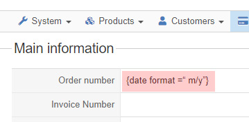 When I use the customized order number like {date format =“ m/y”}