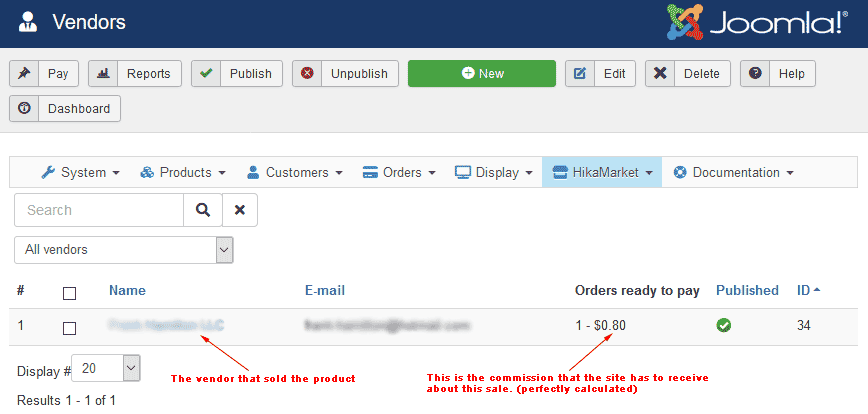 So the Vendor owns 0,8 $ to the site. The vendor at the frontend can see the following when he visits the