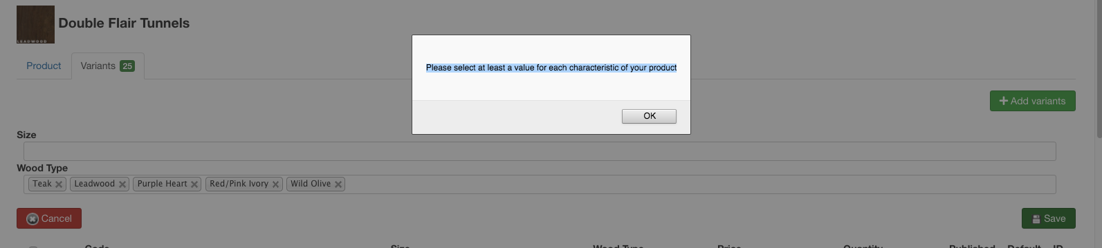 - If you want to use a characteristic for the size and a characteristic for the wood type, you would indeed need to generate the combinations from both characteristic. So that would indeed be 25 * 5 combinations.