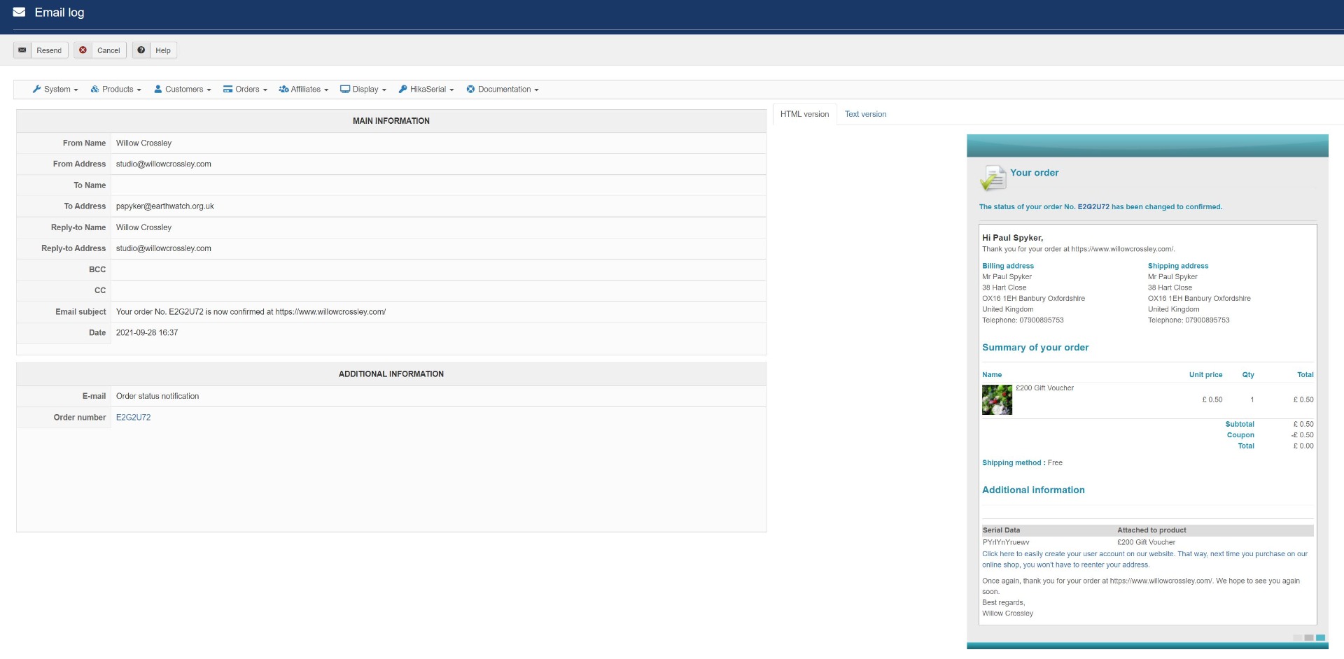 I can see the serial being added to the order status notification in the HTML version near the end, in the "additional information" area.