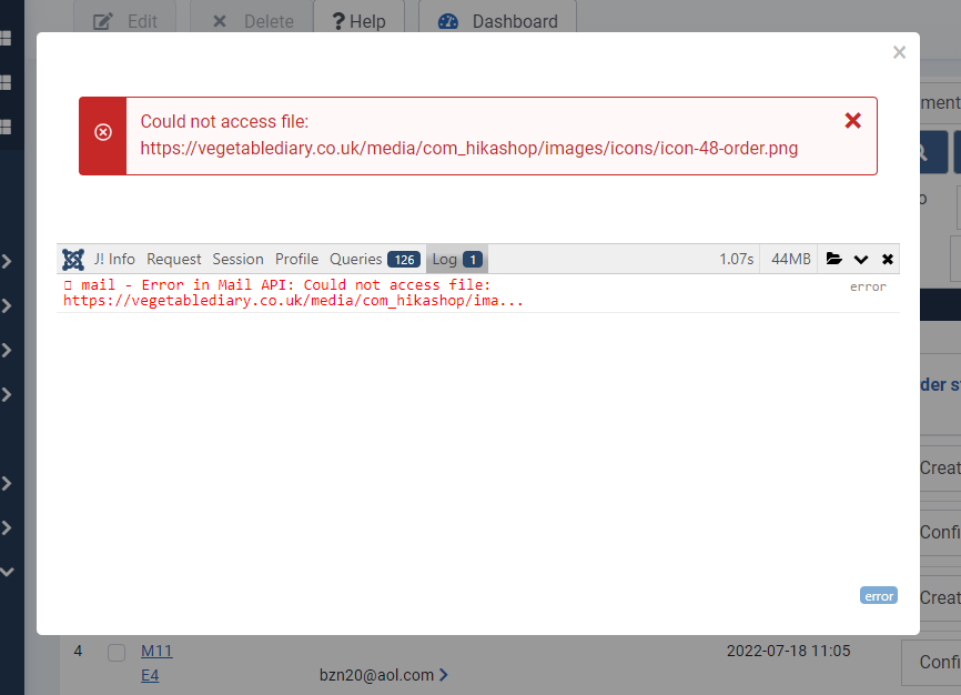 Thank you for your reply. I've activated the Debug mode and created another order, then in the back end I set the order to confirmed. The error message is 'Could not access file: vegetablediary.co.uk/media/com_hikashop/...es/icon-48-order.png '. I've attached a screenprint of the error and also one of some errors that appeared when I created the order, they appeared when adding products to the shopping cart.