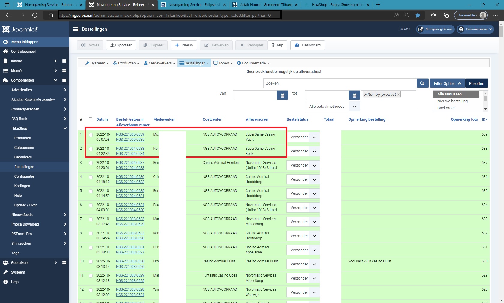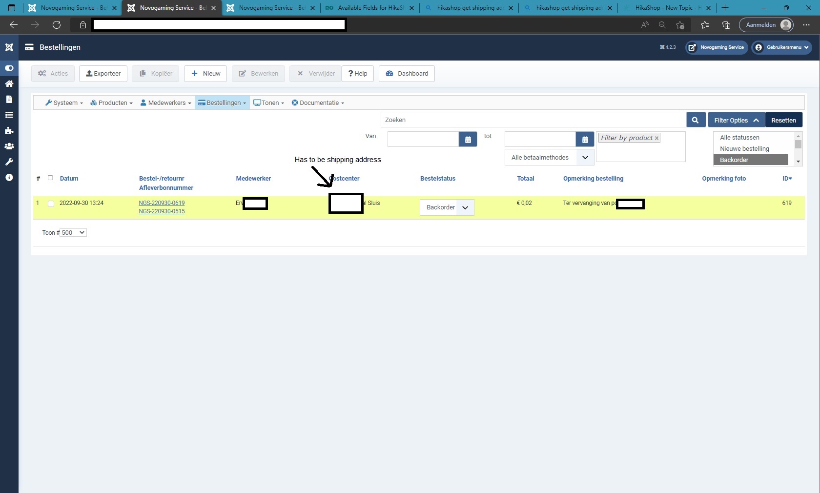 $searchMap = array('c.id','c.username','c.name','a.user_email','b.order_user_id','b.order_number','b.order_id','b.order_invoice_number','b.order_invoice_id','b.order_full_price','d.address_firstname','d.address_lastname', 'b.order_discount_code');It would potentially be possible to search on more fields of the billing address by adding them to that code. But for the shipping address, it's not possible as the shipping address is not part of the MySQL query loading the orders on the page, as I was explaining in my first message on this thread.