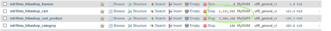 That's not necessarily a problem. If you configured the settings in the HikaShop configuration as I told you to in www.hikashop.com/forum/orders-management...er-carts.html#356597 it means that HikaShop will start deleting carts once they are 1 week old and you should not get more than a hundred thousands carts, which is manageable.
