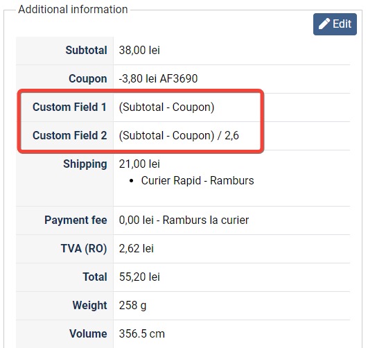 - substract the subtotal and coupon values. You'll want to do a var_dump() of the data to check that you have what you need for your calculations and how to access it. For example, when the order is being created, you'll have the value of the coupon in $order->order_discount_price and the whole data of the coupon in $order->cart->coupon, and you'll have the subtotal object in $order->cart->total ( $order->cart->total->price_value_with_tax or $order->cart->total->price_value based on whether you want the subtotal with or without taxes )