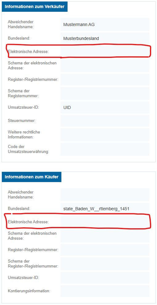 Please note, that the information are present in the ubl file. But only on one of two data fields. The problem is, that the information is partly in one data area und partly in the other. It seems ... divided. Look at screenshot 2 and 3. no 2 show the first data block - here the company name is missing - but all other data is present. screenshot no 3 shows the second data block - here is the email address missed (for seller (verkäufer) and (buyer (käufer).