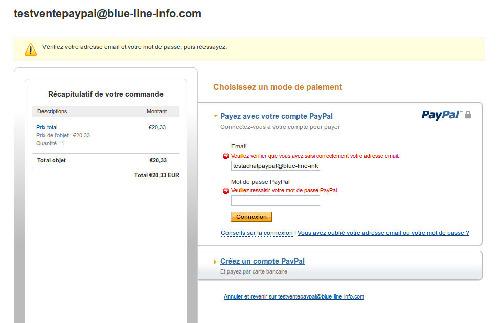 Lorsque j'arrive en fin de procédure de commande c'est à dire au paiement, je renseigne les infos d'acheteur avec testachatpaypal@... et le bon mdp (j'en suis sûr