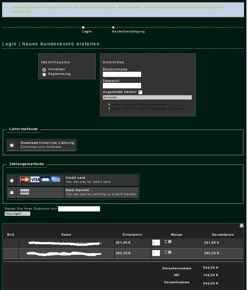 - when i add two different products (two different subscription packets) to the cart, the configured payment methods are shown like i expect it (screen 2)