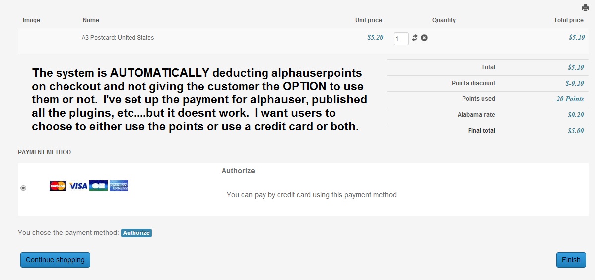 Currently, with the alphauserpoints systems set up on my site....when the user checks out...ALL their points are applied to the order and they don't have the option to choosing NOT to use them at this time and just pay with their credit card.