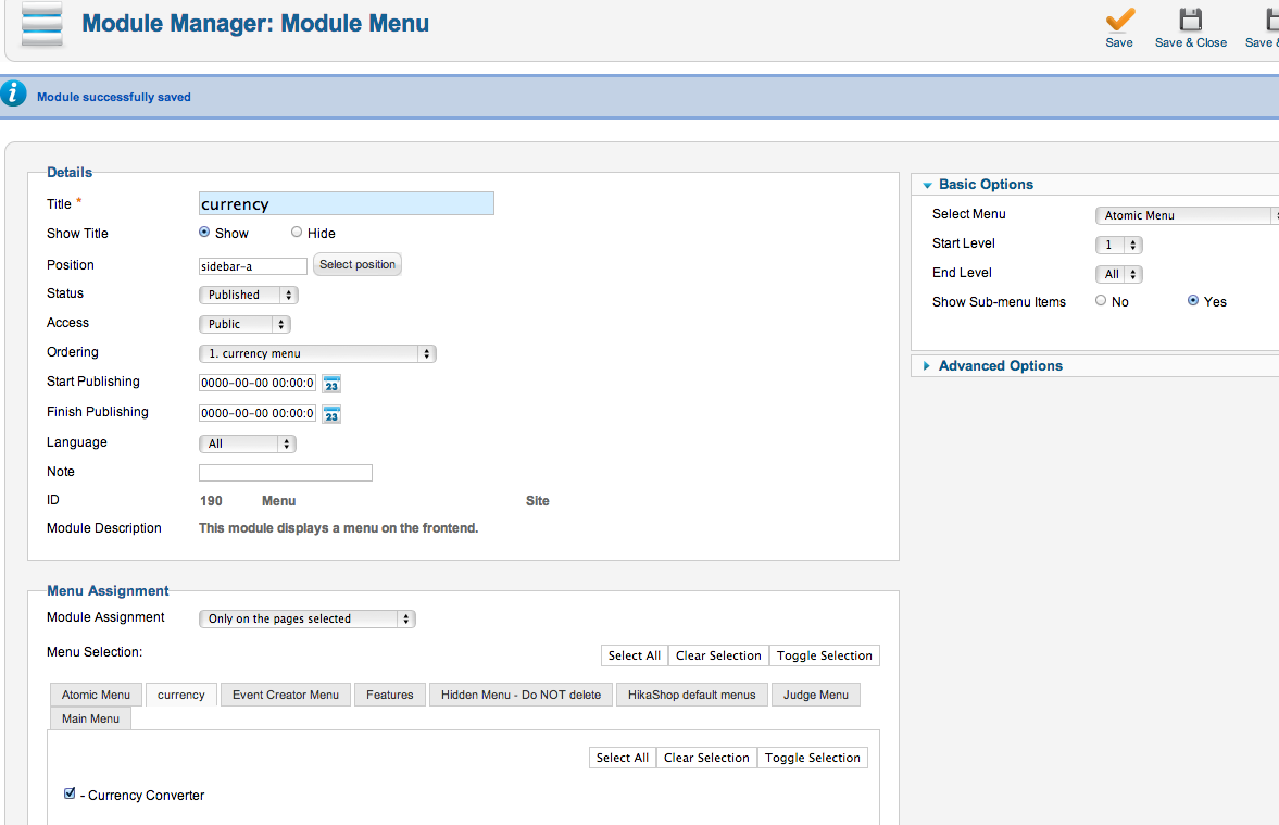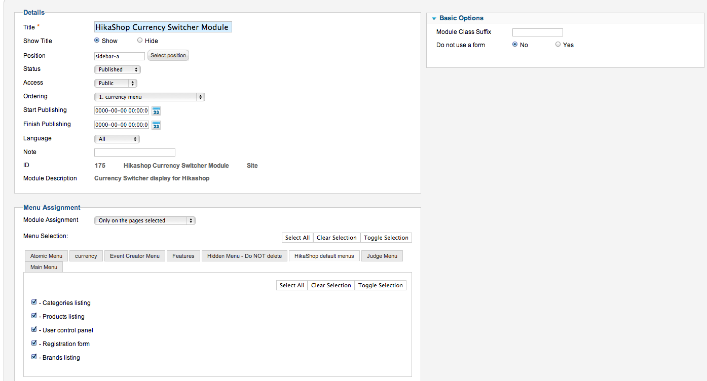 I can get it to work when selecting "on all pages" in the HikaShop Currency Switcher Module (screenshot #1)