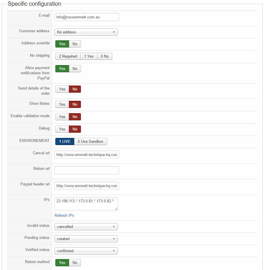 I have attached a screenshot of the settings in the Hikashop Paypal plugin.
